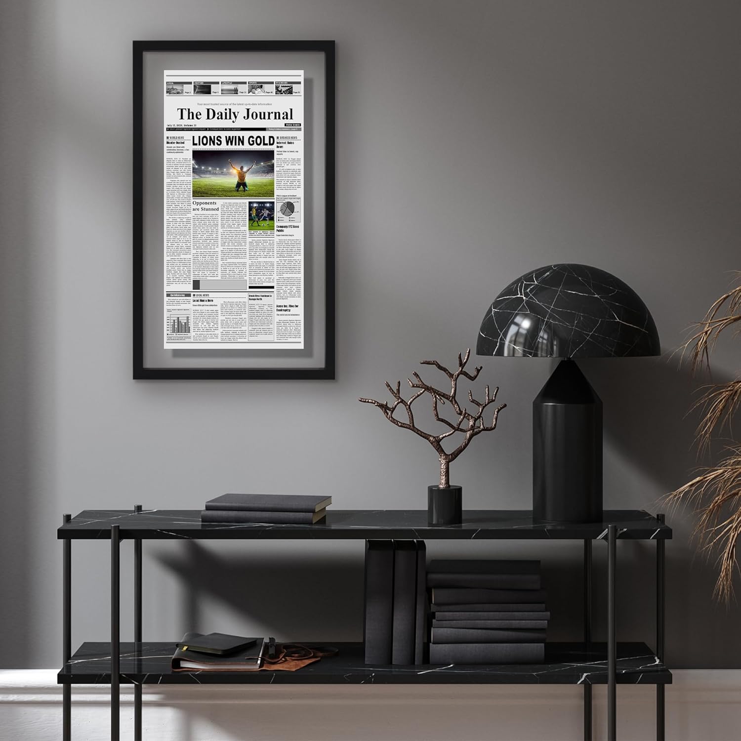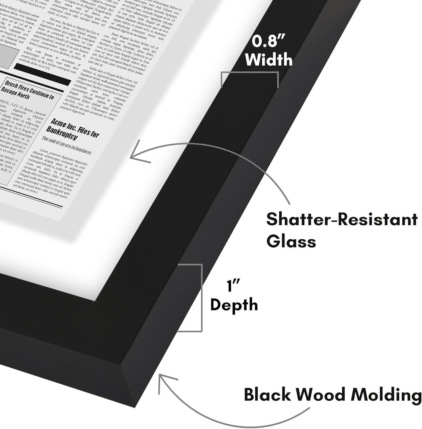 Elevate your home decor with the Americanflat 12.5×15 newspaper frame display in black, crafted with durable engineered wood (MDF) molding, creating a unique floating effect for your cherished memories and favorite newspapers. This newspaper front page frame is perfect for showcasing 11×22 newspapers or smaller, between two pieces of glass, providing a double-sided view and featuring a stylish design and border that seamlessly integrates into any decor. This black picture frame includes hanging hardware for vertical and horizontal wall display, a shatter-resistant glass front, a sturdy plexiglass backing and easy-to-open turn points, providing you with easy maintenance and a modern display. These newspaper frames are built to last, ensuring they become cherished keepsakes for years to come. Don’t settle for ordinary frames. Invest in lasting quality and timeless style with this newspaper floating frame. Order your frame now and join thousands of other satisfied customers who love our products.