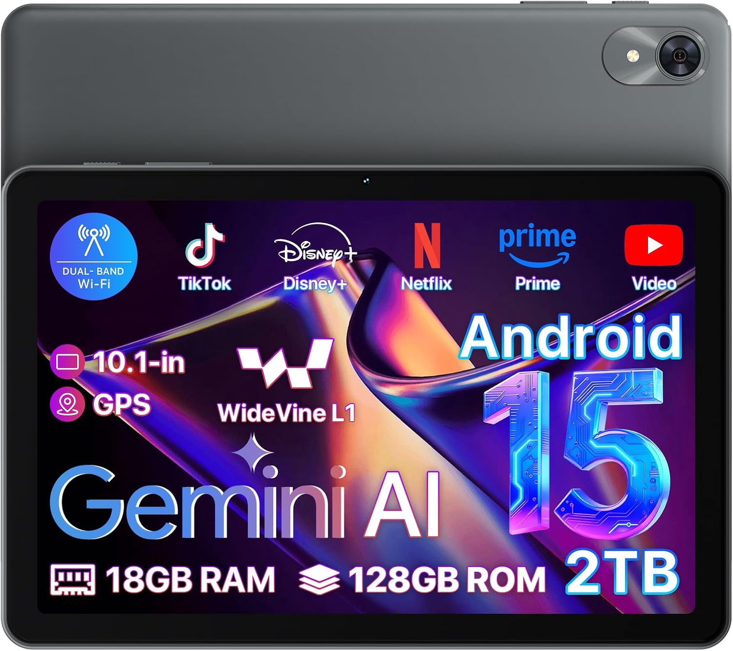Android 15 Tablet 10.1 inch,18(6+12) GB+128GB+2TB Expandable 2025 Widevine L1 Tablets with Speed 2.0 GHz,1280×800 HD IPS,FM Radio, 5000mAh,WiFi6,GPS,Bluetooth,Travel Gift,Kids Space,YT Kids
