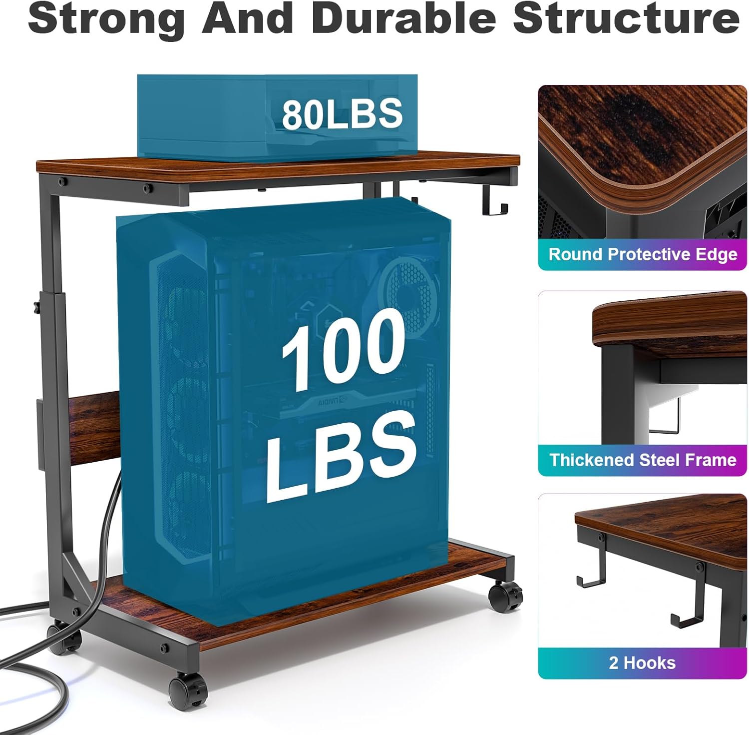 Height Adjustable Computer Tower Stand with Charge Station and USB Charging Port, 2-Tier ATX-Case Cart, Under Desk Mobile PC Stand, CPU Holder Cart with Locking Caster Wheels for Fits Most PC