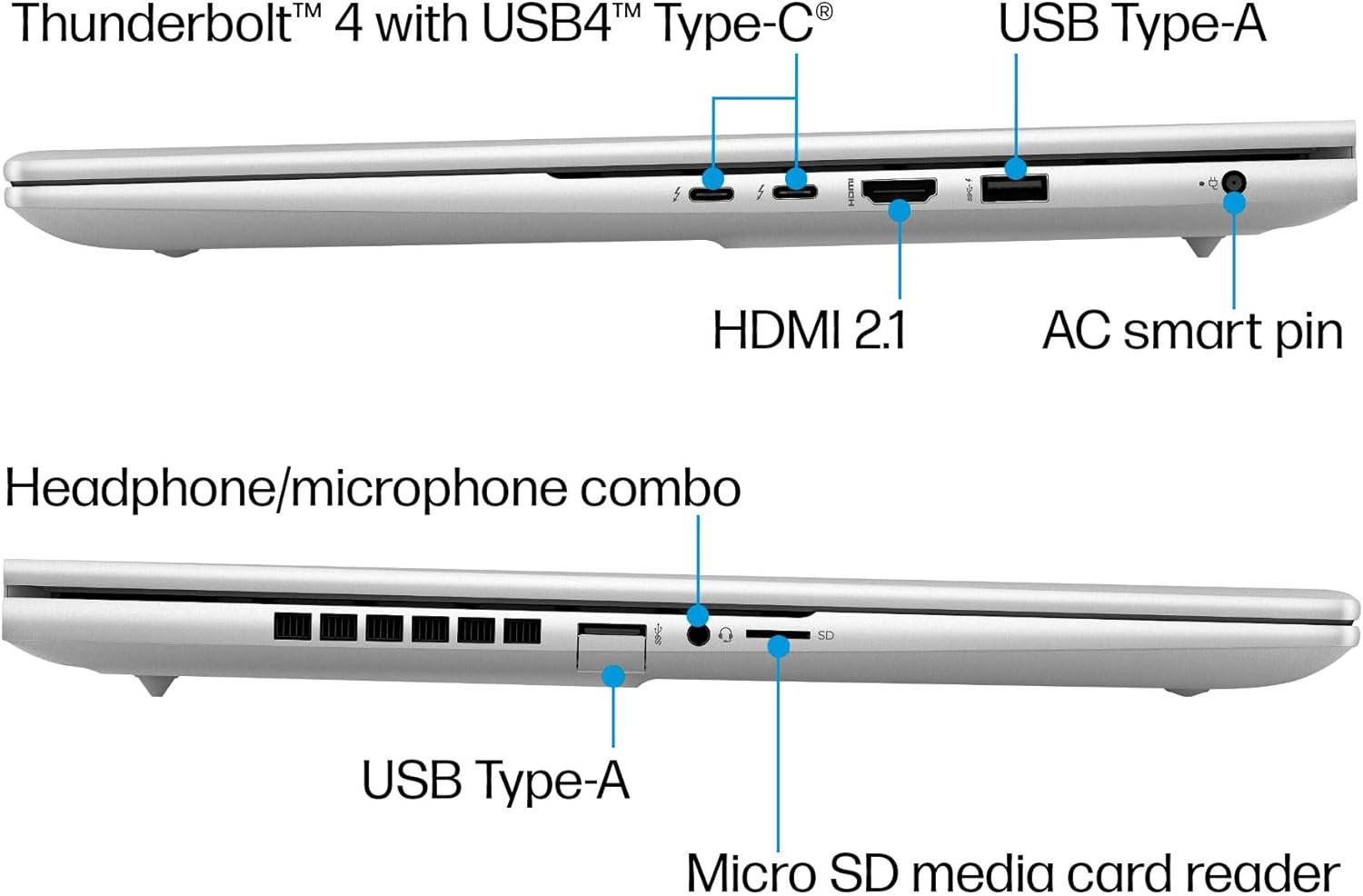 Connectivity: Wi-Fi 6E (2×2 and Bluetooth 5.3 wireless card(supporting gigabit data rate). Ports: 2 Thunderbolt 4 with USB Type-C 40Gbps signaling rate, 1 USB Type-A 10Gbps signaling rate (HP Sleep and Charge), 1 USB Type-A 10Gbps signaling rate, 1 Headphone/microphone combo, 1 AC smart pin, 1 HDMI 2.1.