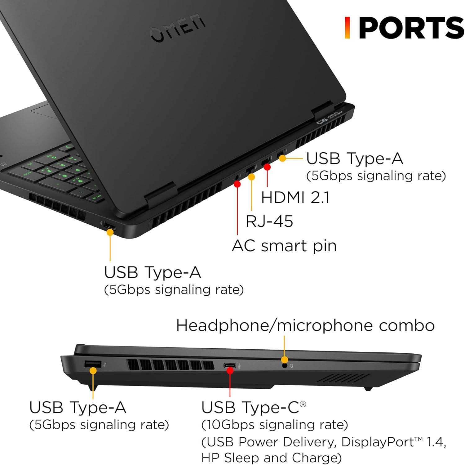 Wireless: Wi-Fi 6E (2×2) and Bluetooth 5.3 Wireless Card. 1 USB Type-C 10Gbps signaling rate (USB Power Delivery 3.0, DisplayPort 1.4, HP Sleep and Charge), 1 USB Type-A 10Gbps Signaling Rate, 2 USB Type-A 5Gbps Signaling Rate, 1 RJ-45, 1 AC Smart pin, 1x HDMI 2.1, 1x Headphone/Microphone combo. HP True Vision 1080p FHD camera with temporal noise reduction and integrated dual array digital microphones; HyperX dual speakers.