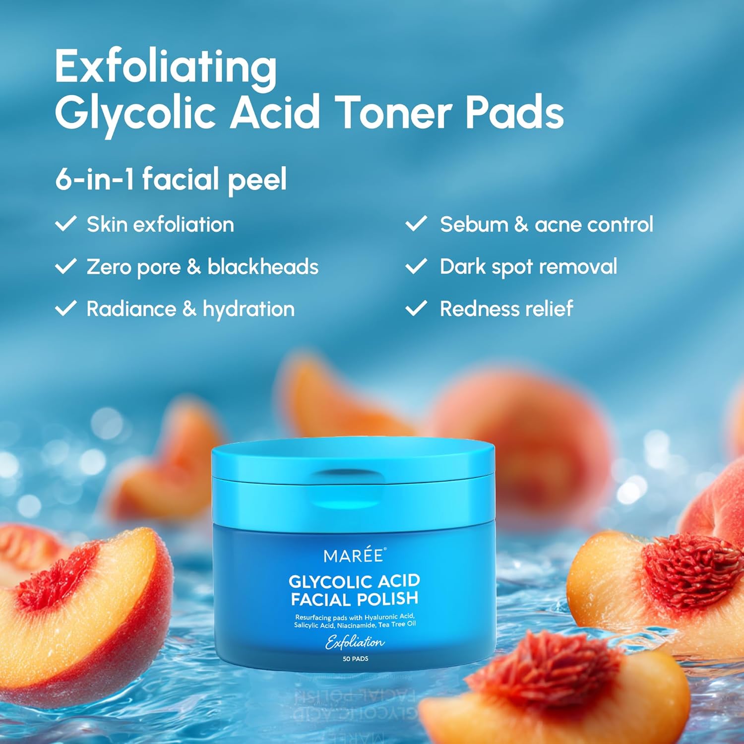 MAREE Glycolic Acid Pads – Toner Pads for Face Cleansing – Exfoliating Pad with Tea Tree Oil, Salicylic Acid & Vitamins E, B3, B5 – Acne Clearing, Skin Pore Resurfacing & Radiance Device – 50 Count