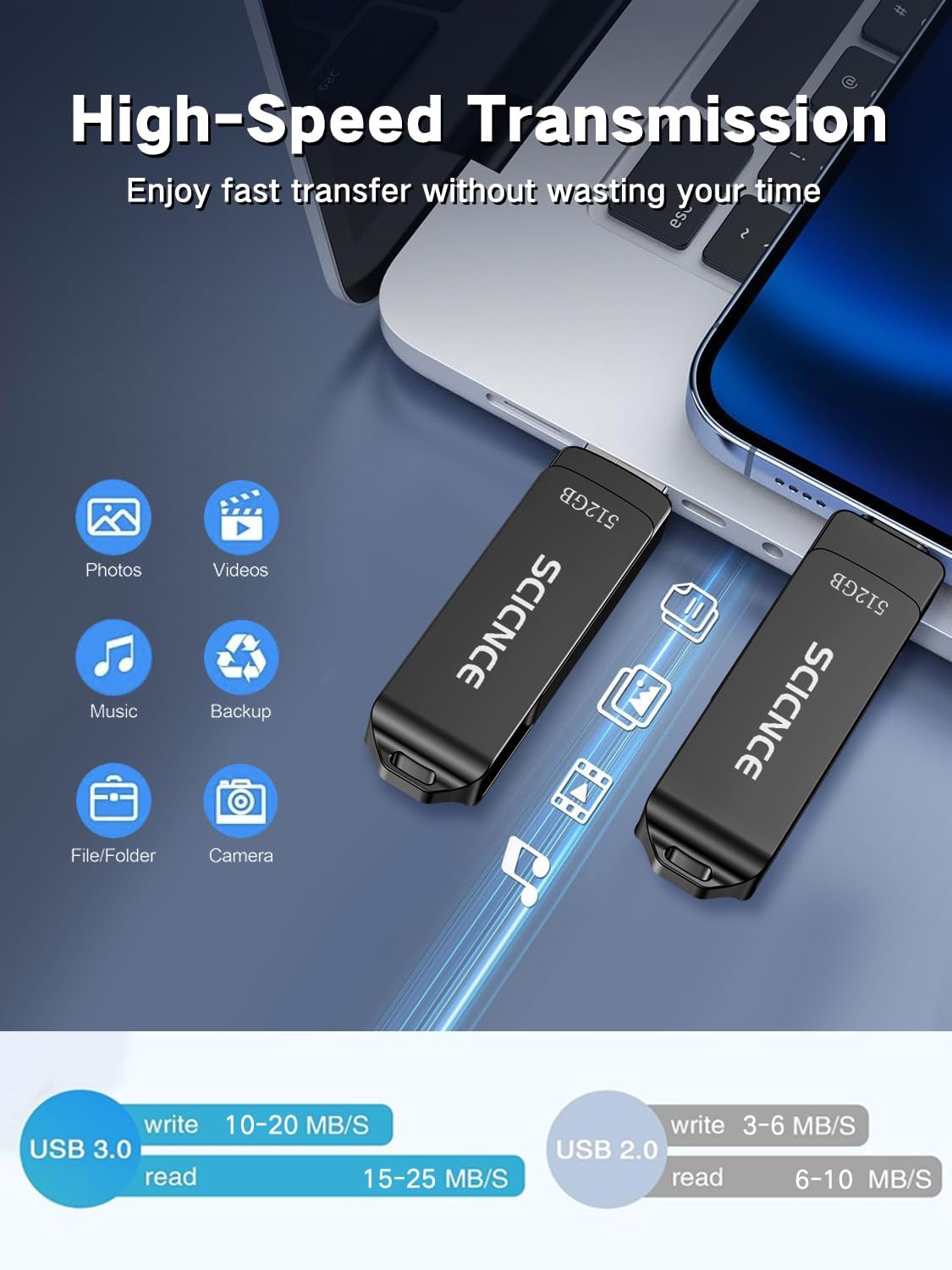 SCICNCE 512GB Flash Drive Intended for iPhone, USB Memory Photo Stick Storage for Photos Videos, Plug and Play No Application Required, Compatible with iPhone iPad Android and Computers (Dark Gray)