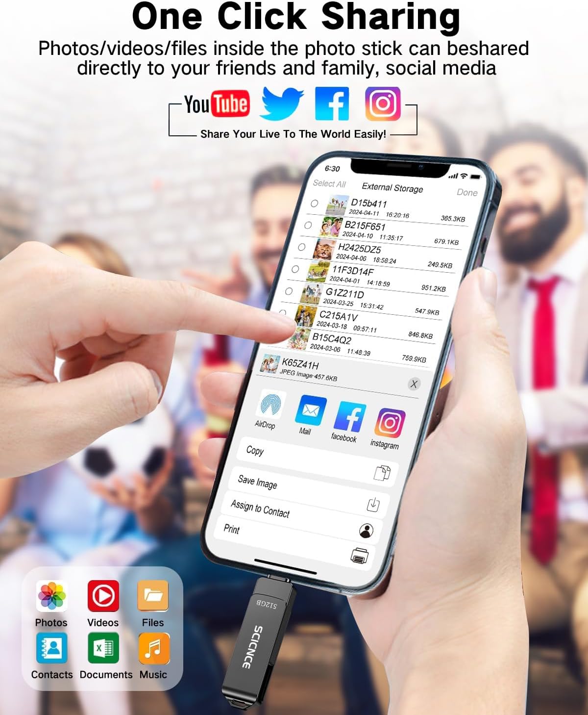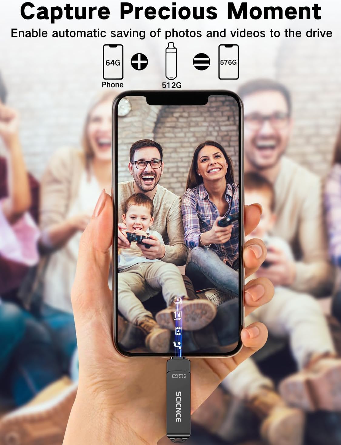 【Plug and Play, No Application Required, Instantly Increases iPhone and iPad Memory Space】With 512GB of additional storage, this iPhone flash drive perfectly addresses memory shortages on your iPhone or iPad. Whether you’re capturing short videos or selfies, simply plug the memory stick in your device, easily back up your photos, videos, and files, share your special moment with your friends and family on your social media with just one-click.
