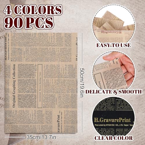 Whaline 90 Sheet Vintage Newspaper Tissue Paper Set Old Newsprint Gift Wrapping Paper 4 Designs Retro Kraft Magazine Art Craft Tissue for Wedding Birthday Party Decor, 13.7 x 19.6 Inch